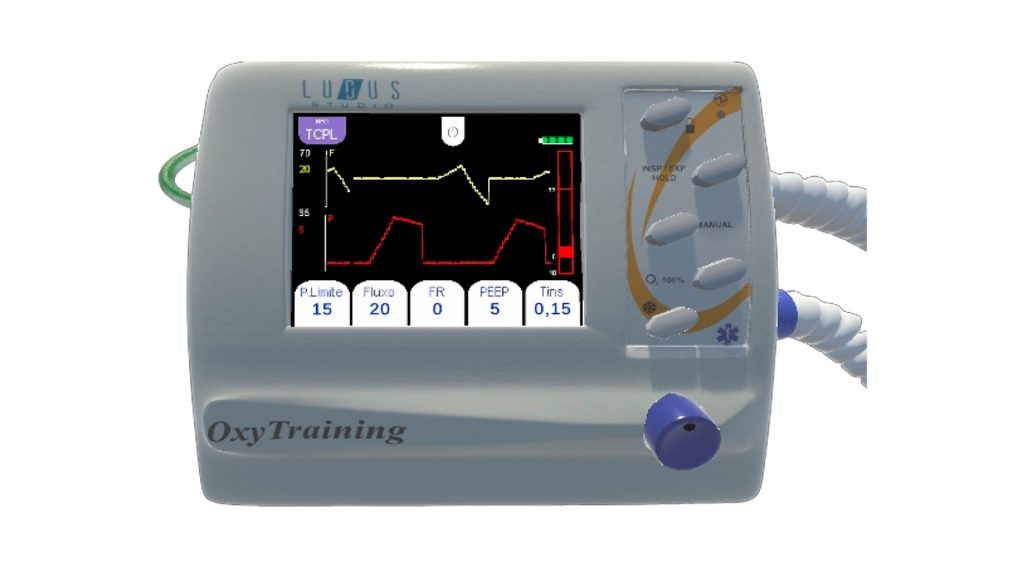 oxy training é  um simulador em modelo 3D de um ventilador mecânico pulmonar de transporte, que corresponde a uma importante modalidade de assistência respiratória.
